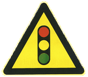 This traffic sign indicates a warning for a traffic light. It alerts drivers to the presence of a traffic signal ahead, especially in areas where the light might be unexpected or hard to see. Drivers should be prepared to stop at a signal-controlled intersection. Common Locations: hidden or unexpected intersections, after bends or hills, temporary traffic signals in roadwork zones.