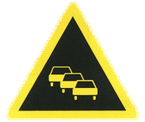 This traffic sign indicates a warning for traffic jams. It alerts drivers to the possibility of sudden or frequent traffic congestion ahead, often requiring reduced speed and increased attention. Drivers should be alert for suddenly stopped or slow-moving traffic.