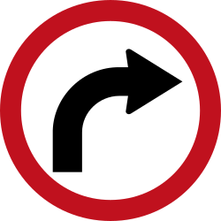 This traffic sign indicates a warning for a curve to the right. It alerts drivers to an upcoming gentle or moderate curve to the right in the road. Drivers should reduce speed and be prepared to steer smoothly to the right. Stay alert, especially in poor visibility or slippery conditions.