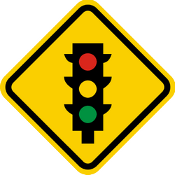 This traffic sign indicates a warning for a traffic light. It alerts drivers to the presence of a traffic signal ahead, especially in areas where the light might be unexpected or hard to see. Drivers should be prepared to stop at a signal-controlled intersection. Common Locations: hidden or unexpected intersections, after bends or hills, temporary traffic signals in roadwork zones.