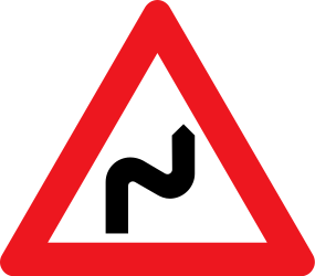 This traffic sign indicates a warning for a double curve ahead, first to the right and then to the left. It alerts drivers of two successive curves, starting with a right-hand bend followed by a left-hand bend. Drivers should reduce speed and be prepared for two changes in direction. Maintain steady control through the curves.