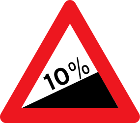 This traffic sign indicates a warning for a steep ascent. It alerts drivers to a steep uphill gradient ahead, which may require lower gears and more engine power to climb safely. Drivers should shift to a lower gear before the climb and be cautious with heavier vehicles or trailers. Maintain steady throttle control to avoid stalling. Common Locations: mountain roads, hilly terrain.
