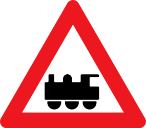This traffic sign indicates a warning for a railroad crossing without barriers. It alerts drivers to an upcoming level crossing where railway tracks cross the road and no barriers or gates are present to stop traffic. Drivers should slow down and look both ways for trains.