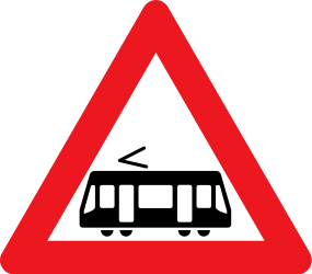 This traffic sign indicates a warning for trams. It alerts road users to the presence or crossing of trams ahead. Drivers should slow down and be prepared for trams crossing or sharing the road. Yield where required (trams often have priority). Be alert for tracks embedded in the road and for trams approaching quietly.