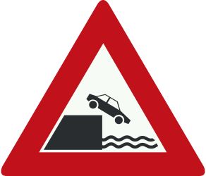 This traffic sign indicates a warning for a quayside or riverbank. It alerts drivers to a waterfront edge, such as a quay, canal, riverbank, or ferry dock, where there is a risk of falling into water if not careful. Drivers should slow down and stay alert, especially at night or in poor visibility. Be cautious in unfenced or unfloodlit quayside areas. Common Locations: riverbanks, canals, harbors, ferry terminals, industrial docks or marinas.
