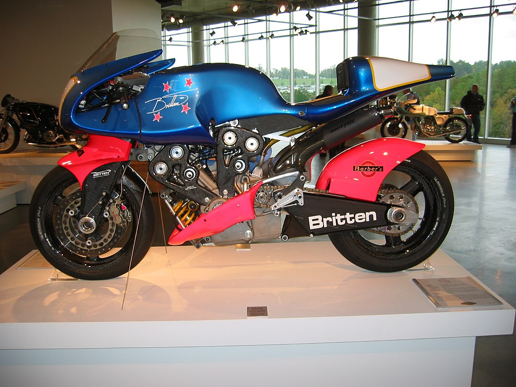 The Britten V1000 is a handbuilt race motorcycle designed and built by John Britten and a group of friends in Christchurch, New Zealand during the early 1990s. The bike went on to win the Battle of the Twins in Daytona International Speedway's Daytona Bike Week festivities in the United States and set several world speed records. The bike was designed from first principles and hosts a number of innovations including extensive use of carbon fibre, the radiator located under the seat, double wishbone front suspension, frameless chassis, and engine data logging. A total of 10 Britten V1000s were produced by the Britten Motorcycle Company and now exist in collections and museums around the world. (Source: Wikipedia.org, CC BY-SA)